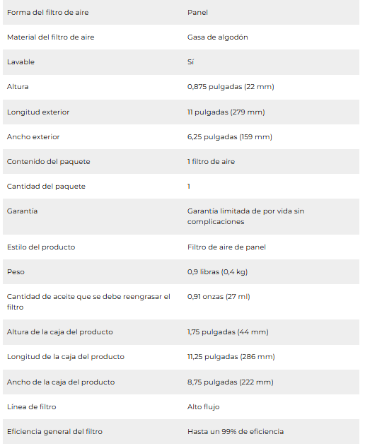 POTENCIA DISEÑADA: El medio de filtrado de aire de última generación está diseñado para aumentar la potencia y la aceleración, así como para mejorar el rendimiento general del motor.