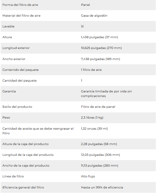 POTENCIA DISEÑADA: El medio de filtrado de aire de última generación está diseñado para aumentar la potencia y la aceleración, así como para mejorar el rendimiento general del motor.